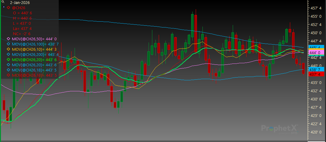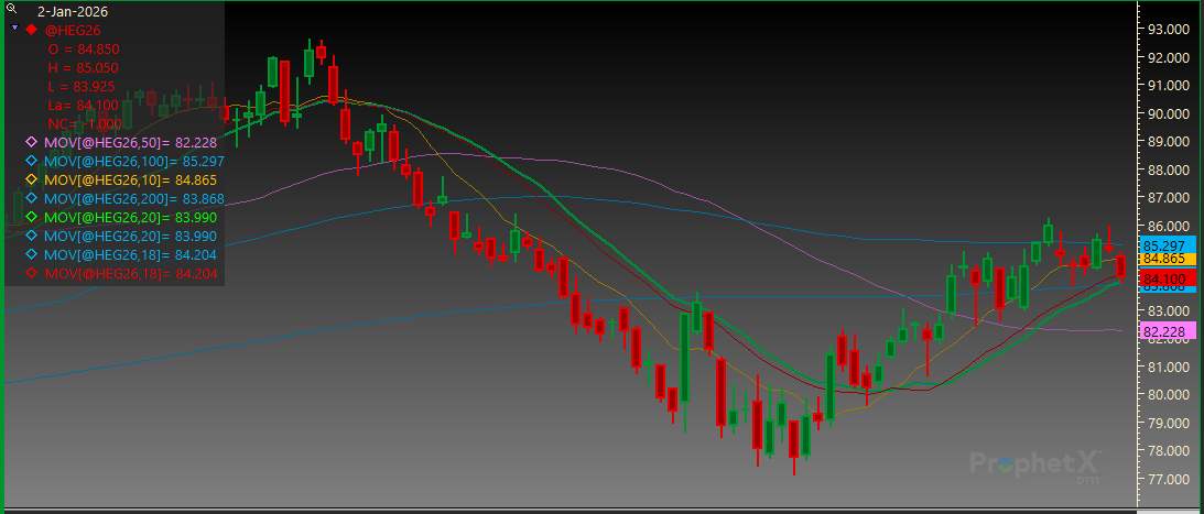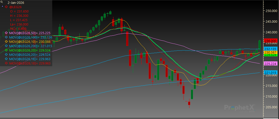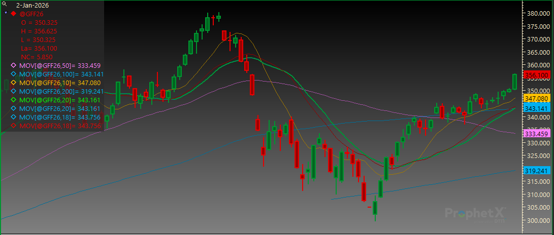 Live Cattle: Live Cattle futures started 2026 by breaking through overhead resistance and pushing to the highest levels since October 24. The February contract had tested the 100-day MA many times but could not trade through until today. After breaking through that line, the gap on the charts from October was filled and now leaves limited resistance areas between here and the contract highs. The cash market will need to show signs of support and improvement in order for the money flow to push the futures that high, but technically, today opened up the top-side in the market. Cash cattle this week has been quiet and very slow. There have been cattle traded today at 232 in the North, while the South has yet to trade with the packers bidding 232. Today’s 232 cash price and the February futures finishing 4.400 higher has created the worst basis in recent history, and possibly in the last two years. Basis has been abnormally good since the beginning of 2024, but the last three months has seen basis levels return to more historical averages or even a bit below that. Boxed beef was higher this morning with choice quoted $1.25 higher at $348.70 and select up $4.56 to $346.94. The choice/select spread has now moved to new lows at $1.76 as the choice cutout has drifted lower than many expectations. The better grading cattle that were mentioned last week can partially be to blame, but it sure seems there are some difficulties taking place in selling the higher priced cuts.
