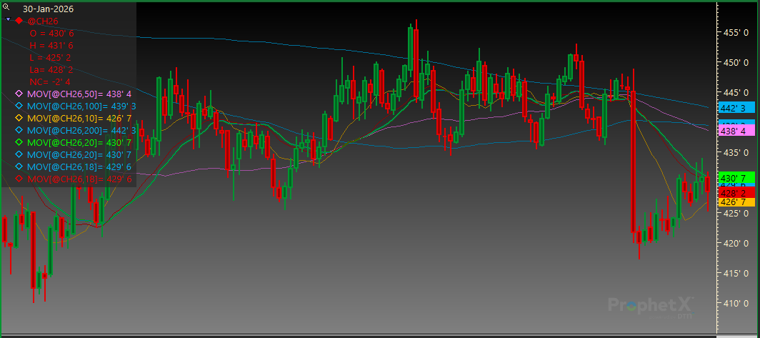 March Corn failed to string together support this week. Resistance is at the 20-day MA of 431 and then 434. Support is at 425 1/4 followed by 421.