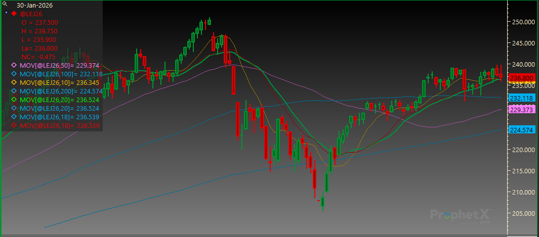 April Live Cattle tested the 20-day MA today. Resistance is at 238.500 and then 239.750. Support is at the 20-day MA of 236.525 followed by 232.650.