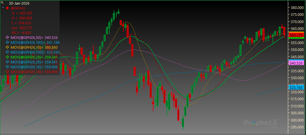 March Feeder Cattle also found support at the 20-day MA today. Resistance is at 367.975 and then 370.675. Support is at the 20-day MA of 369.350 followed by 354.550.