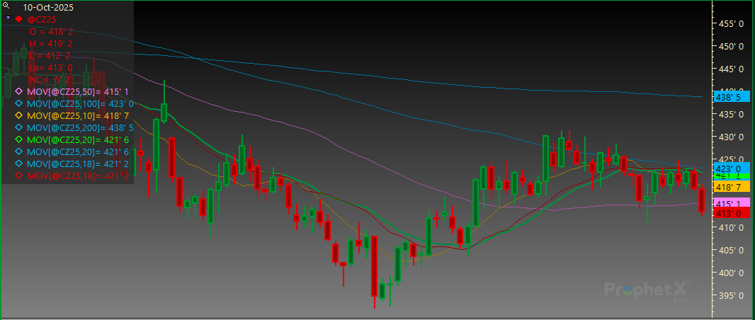 December Corn failed to trade through the 20-day MA this week. Resistance is at the 20-day MA of 422. Support is at 410 1/2 followed by 403 1/2.