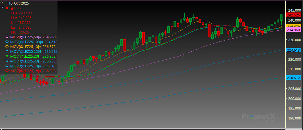 December Live Cattle finished higher each day this week. Resistance is at 242.825 and then the contract high of 243.575. Support is at the 20-day MA of 236.250.