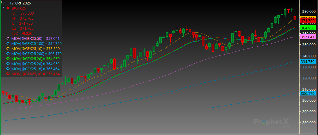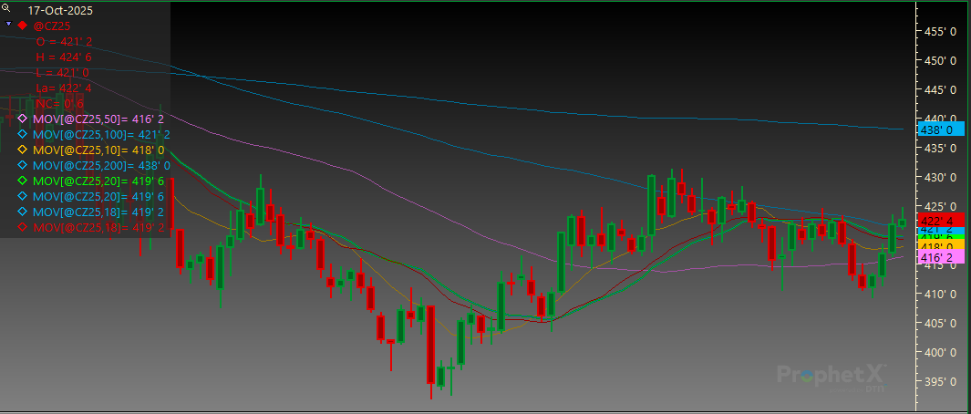 Corn: December Corn futures rebounded this week after finding strong support at 410 on Tuesday. The market pushed higher through midweek, breaking above the 10, 20, 50 and 100-day MA during Wednesday and Thursday’s trade. Friday’s close above the 100-day MA of 421 1/4 has given traders renewed confidence to stay long in this market. The next key resistance level is at 431 1/4, the recent high from September 17. The trade developments between the U.S. and China, or the lack thereof, remain the leading influence on market sentiment. Ongoing speculation over potential policies, tariffs and trade deals has left traders uncertain about the market’s next direction. Weather has also played a role, as rains across parts of the Midwest slowed harvest progress this week. Basis values have firmed a few cents in several local regions due to harvest stoppage and at the Gulf, supported by new export business. In the ethanol sector, production edged higher to 1.074 million barrels per day, up 3,000 barrels from the previous week and slightly above levels from a year ago. Ethanol stocks remain historically tight for mid-October. Meanwhile, soybean crush data for September came in at 197.9 million bushels, up 20.6 million from last year and 11.9 million from August. The soybean complex remains rangebound, with any breakout potential dependent on future trade headlines with the U.S. and China.