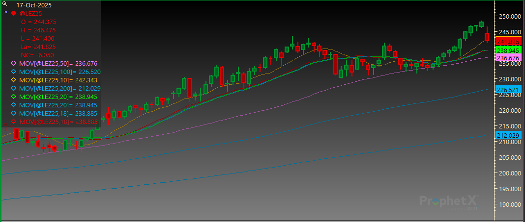 December Live Cattle finished the day lower for the first time in 11 days. Support is at the 20-day MA of 238.950 followed by 237.275. Resistance is at 247.875.