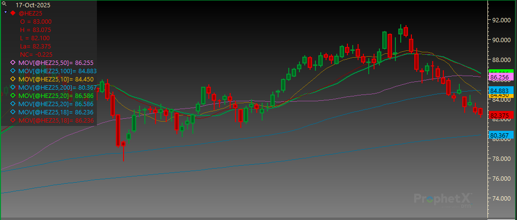 Live Cattle: Live Cattle futures traded sharply lower all day after President Trump announced “I think we have a deal that’s going to bring beef prices down.” No one is sure how he is going to accomplish this, but the futures do not like uncertainty and negative headlines. The common thought across the beef complex is President Trump will relax the 50% tariff on Brazil that has made it economically impossible for Brazil to sell the U.S. their beef, or during communications with the President of Argentina this week the two struck some sort of deal to increase imports from the country. President Trump made comments about high beef prices a few months ago but nothing ended up happening at that time. No matter what the plan is, the futures did not like the news and erased all of their gains from the previous five days. Cash cattle traded higher again this week as feedlots looked to minimize the negative basis that has taken over the market the past month. Most of the cattle in the North traded at 240 on Thursday with 241 in Iowa on Friday. The South traded at 240 as well. Boxed beef was higher this morning with choice up $0.89 to $367.00 and select was $1.43 higher at $350.36. This is the second week in a row that choice boxes will finish higher. This week choice only gained $0.73, but is much better then the $10+ losses that were seen for four consecutive weeks during September. The Live Cattle complex will have expanded limits of 10.750/cwt on Monday.