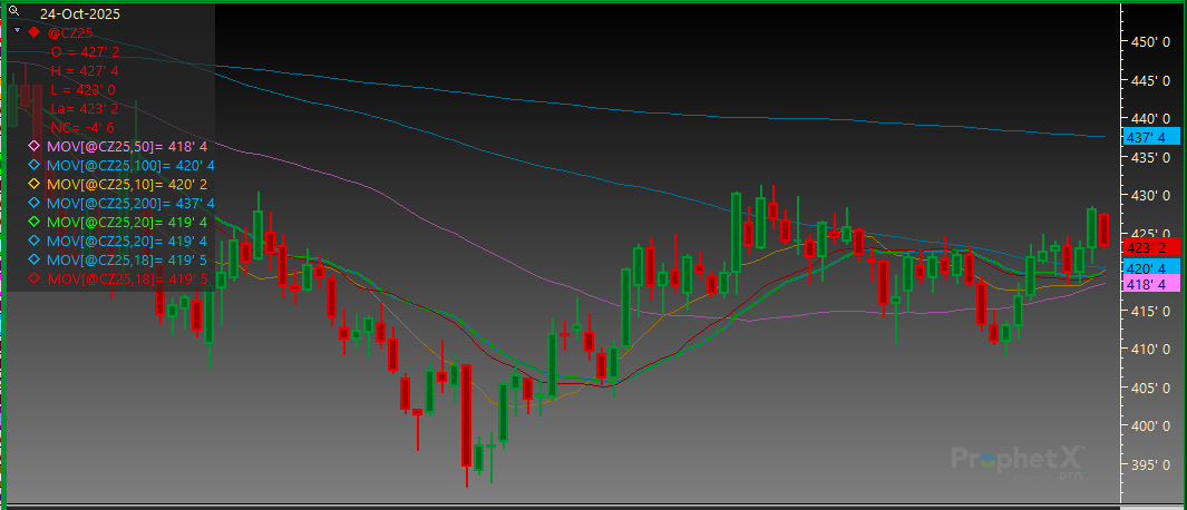 December Corn finished the week lower after a positive week. Support is at the 20-day MA of 419 1/2 followed by the 50-day MA of 418 1/2. Resistance is at yesterday’s high of 428 1/2 and then 431 1/4.
