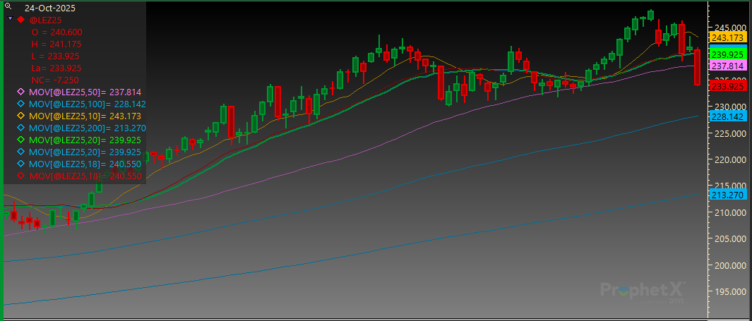 December Live Cattle broke long term support lines today for the first time since April. Support is at 231.750. Resistance is at the 50-day MA of 237.800 followed by the 20-day MA of 239.925.
