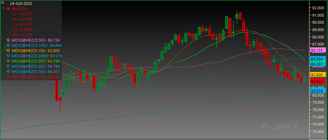 December Lean Hogs posted a new low for the move today before finishing the day higher. Support is at 81.675 followed by 81.075. Resistance is at 84.050 and then the 20-day MA of 84.800.