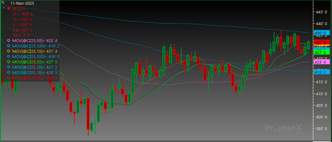December Corn has held the 20-day MA this week. Support is at the 20-day MA of 427 1/2 followed by 426 1/4. Resistance is at the 200-day MA of 436 and then 437.