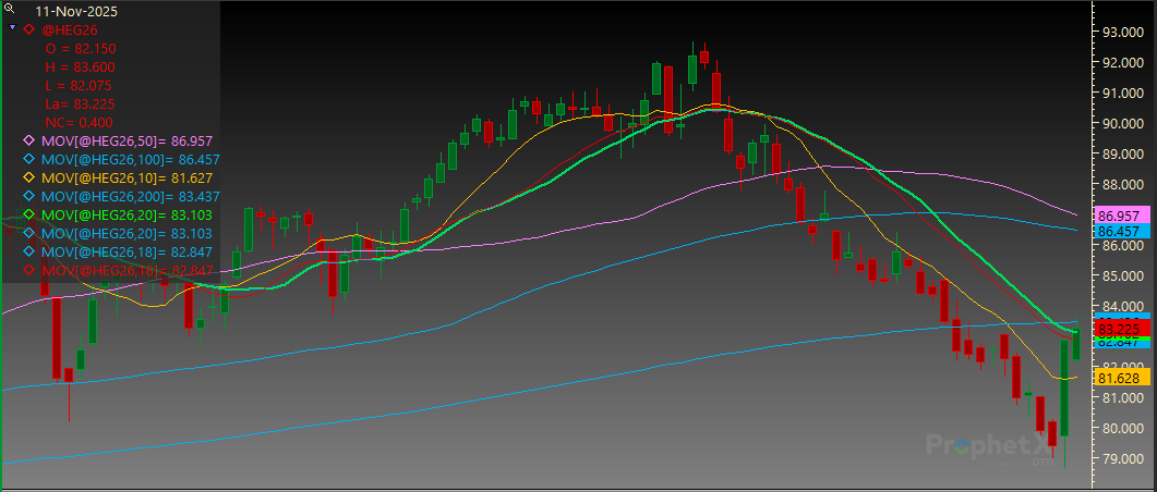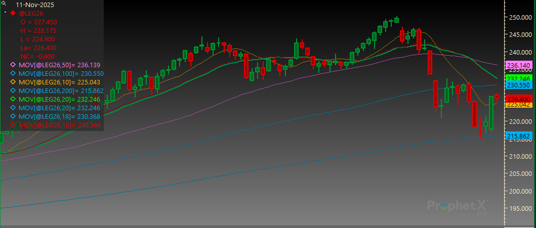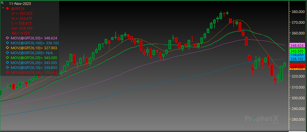 Live Cattle: There has been no shortage of news affecting the cattle market to begin this week. After the markets closed on Friday, President Trump instructed the Department of Justice to open an investigation into the meat packing industry. This news came with mixed reviews from many traders as the President was removing the blame of high beef prices from the ranchers and feedlots, but was again putting beef into the news and continuing to drive home his plan to lower the price of beef. Regardless of who he is blaming for the high price of beef, the end goal is to see cheaper beef available to the consumer. Later in the weekend, President Trump announced that he is considering a round of stimulus money to most Americans. That same day news broke that the government would most likely be reopening later this week and in turn reinstate SNAP payments. The cattle complex opened sharply lower on Monday before finishing the day limit higher. Live Cattle finished lower today after spending a majority of the day trading higher. The cash market continued to trade lower into the end of last week with 225 being paid in the North late in the day on Friday. There has not been any cash movement up to this point of the week, but fat cattle in the sale barns appear to be lower than a week ago. Boxed beef was higher this morning with choice quoted at $380.42, up $3.10 and select up $0.70 to $360.40. All of the publicity surrounding the price of beef has yet to affect the price of boxed beef or the price of beef at the meat counter. Last week’s kill was revised 8,000 head higher to 560,000 head. Expectations for this week’s slaughter is in the 560,000-565,000 head range. The packers have ramped up their kill speeds as their profitability has improved and they are trying to meet holiday demand.