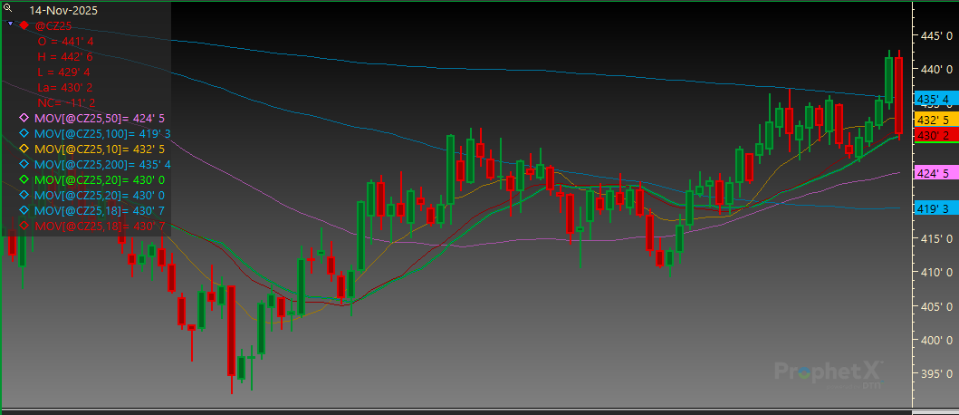Live Cattle: Live Cattle futures held contract support levels today and finished the day higher. After starting the week with a limit up move, Live Cattle traded lower the next three days as cash trade was a disappointment. Cattle in the North traded from 222 to 225 throughout the week, while the South received 228 for the majority of their cattle. Boxed beef worked lower this week and will finish with losses in both choice and select. Choice was down $6.75 for the week, finishing at $370.68 while select lost $7.67 to $354.53. Packers have ramped up their kill the past few weeks as their margins have improved. Last week’s kill was revised higher to 560,000 and this week’s kill is estimated at 576,000. This week’s kill is the largest weekly total since the beginning of June and will help clean up some of the big cattle that are in the feedlots. The cattle complex continues to trade the news that comes out of The White House and the remarks from President Trump. President Trump continues to drive home his plans to lower the price of beef to the consumers. After the market closed today, The White House announced that President Trump would be signing an executive order that would reduce tariffs on beef, aiming to lower costs on groceries amid persistent food inflation.