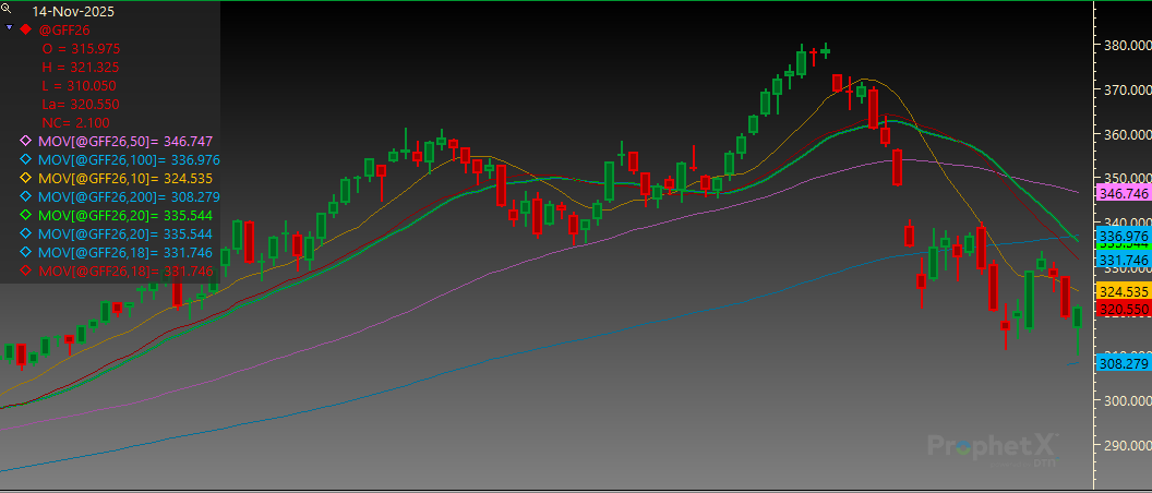 January Feeder Cattle posted a new low for the move this morning. Support is at 310.050 followed by the 200-day MA of 308.275. Resistance is at 333.475 and then the 20-day MA of 335.550.