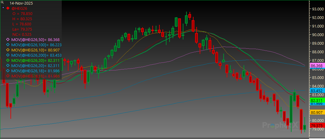 February Lean Hogs posted a new low for the move yesterday. Support is at that low of 78.450 followed by 77.200. Resistance is at 81.350 and then the 20-day MA of 82.300.