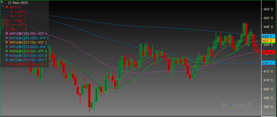December Corn lost downside support this week. Support is at the 50-day MA of 425 1/2 and then the 100-day of 419 1/2. Resistance is at the 20-day MA of 431 3/4.