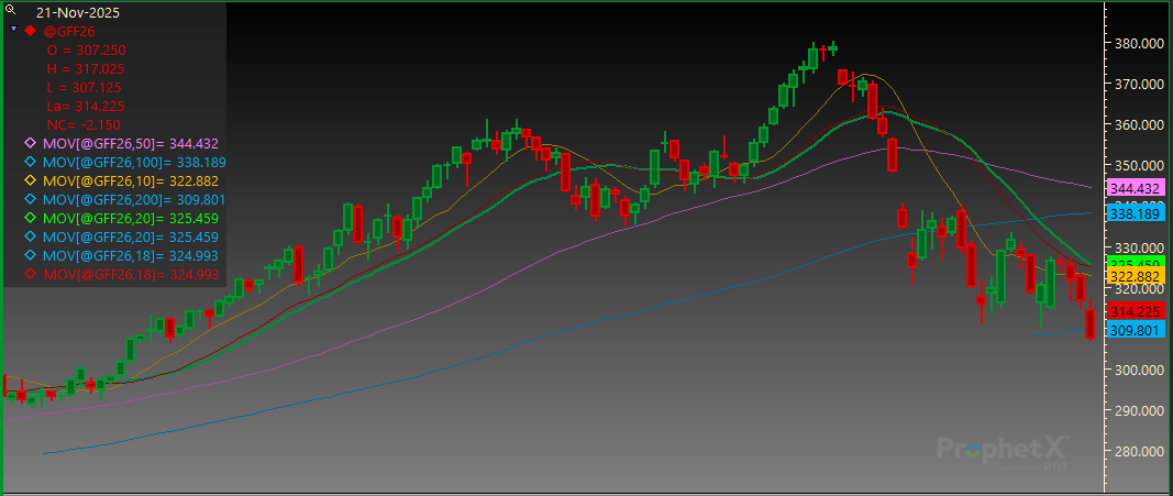 Lean Hogs: After two days of higher closes, the Lean Hog complex closed lower today. The December contract lost 1.675 finishing at 77.800 which is now $7.66 under the current Lean Hog index of $85.71. The national cash average this morning was quoted at $70.80. The pork cutout was $2.93 lower on Thursday afternoon at $90.21. This morning, the pork cutout was quoted $2.59 higher at $92.80. Slaughter last week was 2,701,000 which is the largest total slaughter week of 2025. This week’s slaughter is estimated to be 2,650,000. Next week, with the Thanksgiving holiday, estimates will be around 2,300,000. With the smaller slaughter numbers, the pork cutout should stabilize with less product being offered.