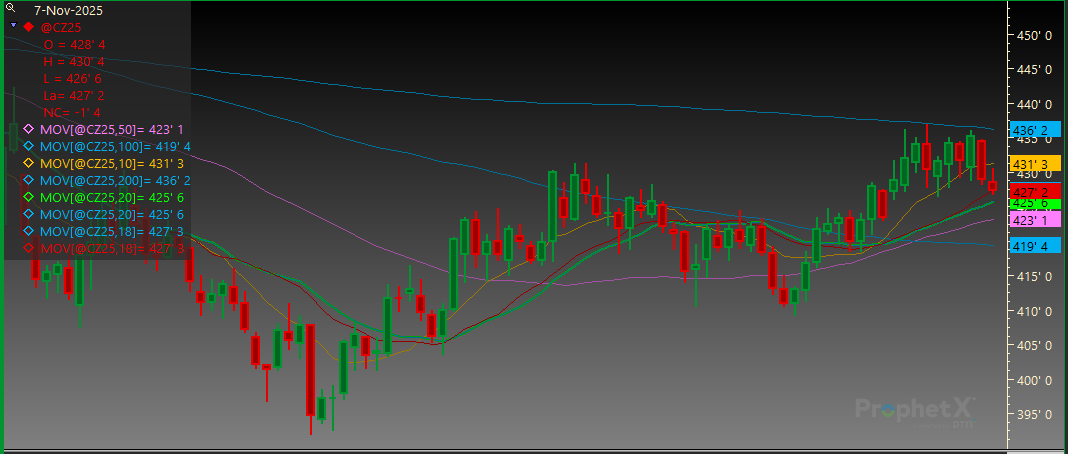December Corn finished lower each of the last two days. Support is at 426 1/2 followed by the 20-day MA of 425 3/4. Resistance is at the 200-day MA of 436 1/4 and then 437.