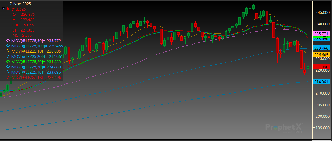 December Live Cattle traded down to long term support this week. Support is at 218.075 followed by 215.350. Resistance is at 222.950 and then 232.975.
