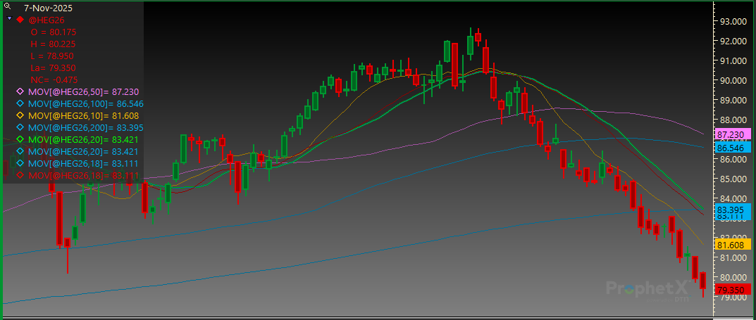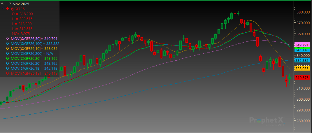 Feeder Cattle: Feeder Cattle futures finished the day higher after another week of steep losses. The most actively traded January contract lost 12.325/cwt this week and finished 20.050/cwt off of the highs from Tuesday. Since the January contract posted a contract high of 380.200 on October 16, the market had lost 68.800/cwt at this week’s low. Volatility and lack of liquidity have been the theme this week within the Feeder Cattle complex. The CME Feeder Cattle index has worked lower as well, but not to the extent of the futures market. Currently, the index is at $347.82 which is $21.42 above the nearby November contract. Traders are caught between negative sentiment in the futures market and the cash market that is slow to work lower. The futures market is cautious to work higher as everyone fears the next press release from Washington, DC, along with a poor technical picture at current levels. The cash market continues to hold higher than the futures market currently supports and has not corrected lower. The feeling within the futures complex is that rallies will be sold and create headwind for long sustained rallies. Up to this point in 2025, all moves lower were met with buying and that is what pushed us to new all-time highs less than a month ago.