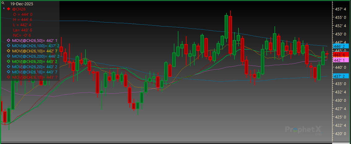 March Corn finished above the 20-day MA today. Support is at the 20-day MA of 443 1/4 and then 436. Resistance is at 446 followed by the 200-day MA of 446 1/4.