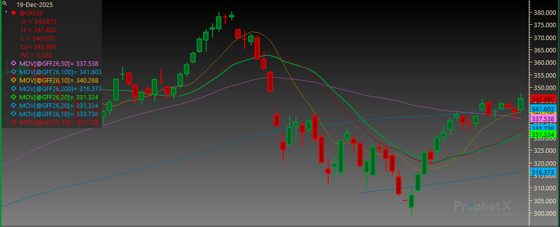Feeder Cattle: Feeder Cattle futures broke through technical resistance levels this morning and are now eyeing the gaps on the charts that were left in October. The CME Feeder Cattle index continues to hold a premium to all futures contracts as many salebarns are again setting all-time record sales. Some classes of Feeder Cattle are now selling just as high as we saw at the beginning of October when the Feeder Cattle futures were trading at 380.000 and Live Cattle futures were at 250.000. Optimism for future prices, tight supplies of available Feeder Cattle, and stagnant Corn prices have all contributed to the high price of Feeder Cattle. Today’s Cattle on Feed Report showed placements for the month of November down 11% compared to a year ago. Kansas and Texas saw sharply lower placements again this month as the closure of the Mexican border continues to hamper their ability to find Feeder Cattle. Texas placements were down 17% or 60,000 head. Kansas placed 80,000 less cattle than a year ago or 20% less. Nebraska also placed 10% less cattle while Iowa placed 3% more cattle than November 2024.