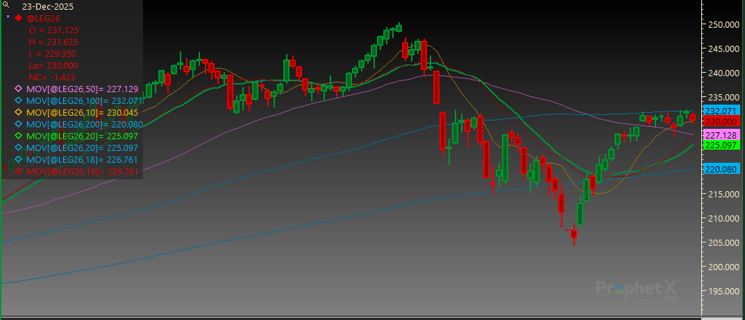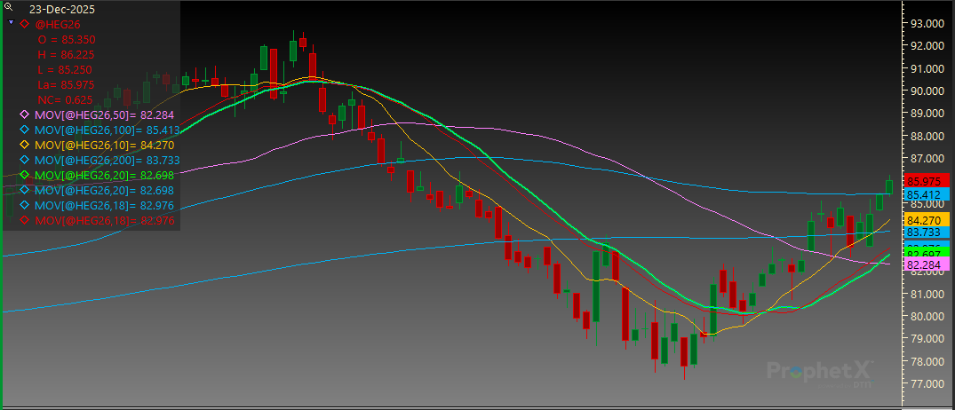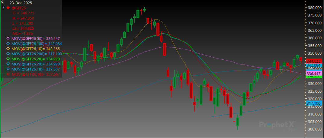 Feeder Cattle: Feeder Cattle futures pushed to new highs for the move yesterday but could not find follow-through today. The 100-day MA, that has been resistance for the complex for most of December, offered support today and most contracts finished nearly 1.500 off of their lows. The CME Feeder Cattle index continues to work higher and has now reached its highest level since the end of October. Through yesterday’s sales, the index is quoted at $353.08 which is up $1.17 from the end of last week. Sale volumes will be very limited as we head into the end of the year as many salebarns will not have sales. Last year, from December 23 until the end of the year the Feeder Cattle index fell $9.03. During the first ten days of 2025, the index increased $24.58. One year does not make a trend, but with the limited sales at the end of the year and the decrease in volume of Feeder Cattle, it is something to pay attention to as we finish 2025. The beginning of the year will bring big sales across the country with bigger volumes and increased buyer interest.