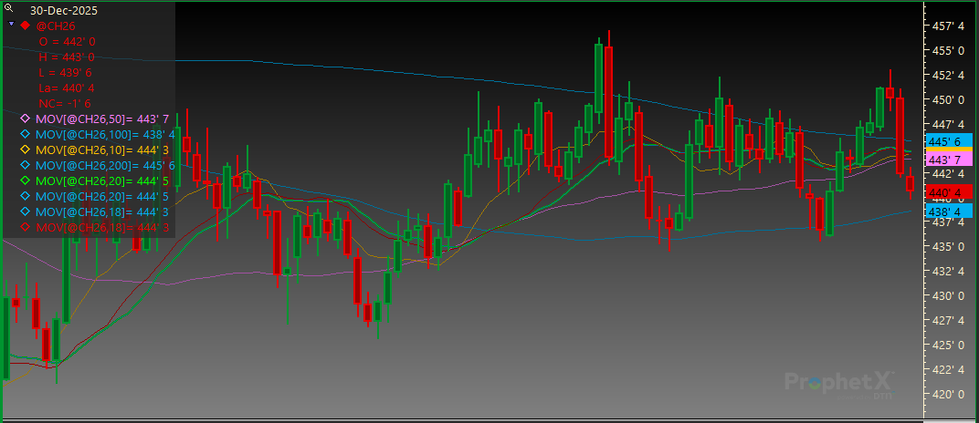 March Corn has finished lower three days in a row. Support is at the 100-day MA of 438 1/2 followed by 435 1/2. Resistance is at the 20-day MA of 444 1/2 and then 453.