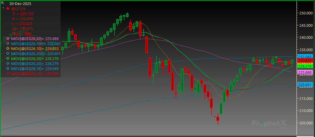 February Live Cattle continue to trade within the same range. Resistance is at the 100-day MA of 232.050 and then 232.325. Support is at the 20-day MA of 228.275 followed by 227.550.