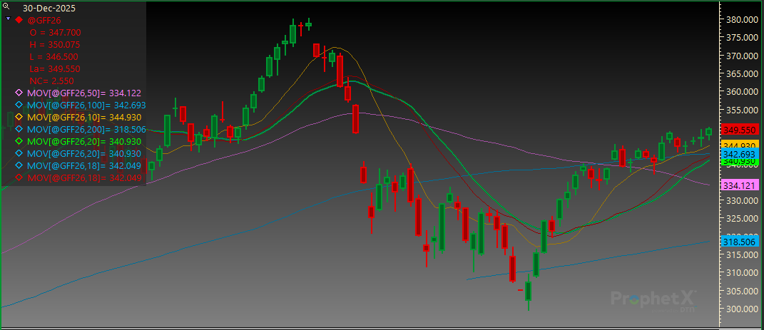 Feeder Cattle: Feeder Cattle futures have enjoyed the lower corn market the first two days this week and have pushed to new highs for the move. The March contract filled its gap on the chart perfectly today, while the January contract traded back above 350.000 for the first time since October 24. The CME Feeder Cattle index has been extremely volatile the past few days as very limited amounts of Feeder Cattle are being sold around the holiday weeks. Today’s release of the CME Feeder Cattle index was $7.96 lower at $348.04. The light volume of sales will remain until the beginning of next week before sale barns begin big runs of cattle again. The Feeder Cattle futures have come to an interesting spot as we end the year. Some technical objectives have been met and the cash market continues to move higher. The start of 2026 will be telling as to the direction that the complex will take for the first part of the new year.