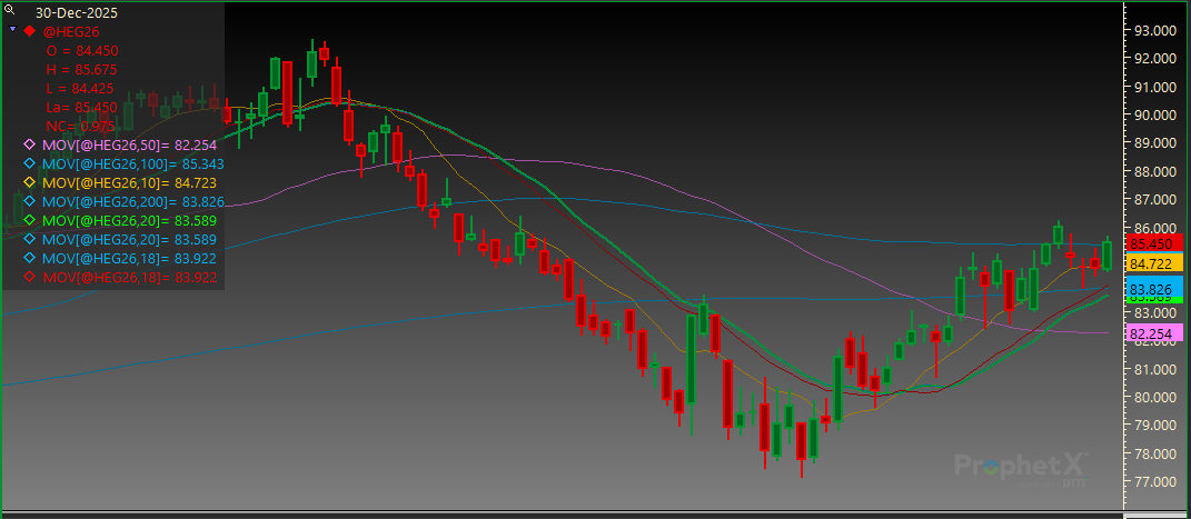 February Lean Hogs finished above the 100-day MA today. Resistance is at 86.225 and then 86.375. Support is at 83.825 followed by the 20-day MA of 83.600.