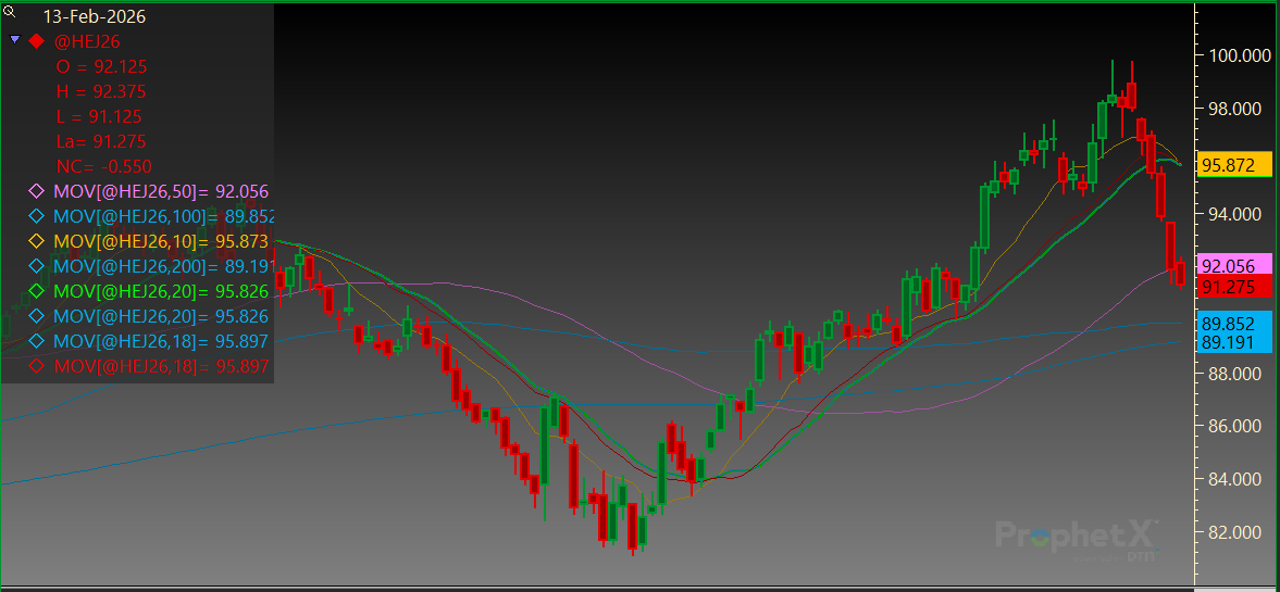 Lean Hogs: Lean Hog futures finished lower each day this week and extended their streak to seven days in a row. After the open interest within the complex climbed at a record pace for the first four weeks of 2026, open interest has fallen sharply over the past week. The decrease in open interest would indicate that the managed money has began liquidating their long position that had been built over the course of the past two months. Today’s CFTC Report showed the managed money as buyers of 4,424 contracts for the week ending on Tuesday. This increased their net long position to 133,281 contracts, and at that time, not too far from the all-time record of 146,288 contracts. Next week’s report will show what happened in the final three days of this week. The cash fundamentals surrounding the Lean Hog complex have been relatively flat and the pork cutout remains in the mid $90 range as domestic demand remains strong and exports continue to run at good levels.