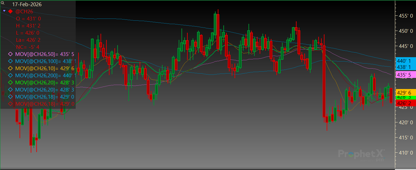 March Corn futures tested downside support today. Support is at 425 1/4 and then 424. Resistance is at 432 3/4 followed by 436.
