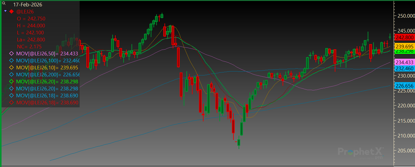 April Live Cattle gapped higher this morning but could not take out the most recent high. Resistance is at 244.575 and then 246.875. Support is at 241.675 followed by the 20-day MA of 238.300.