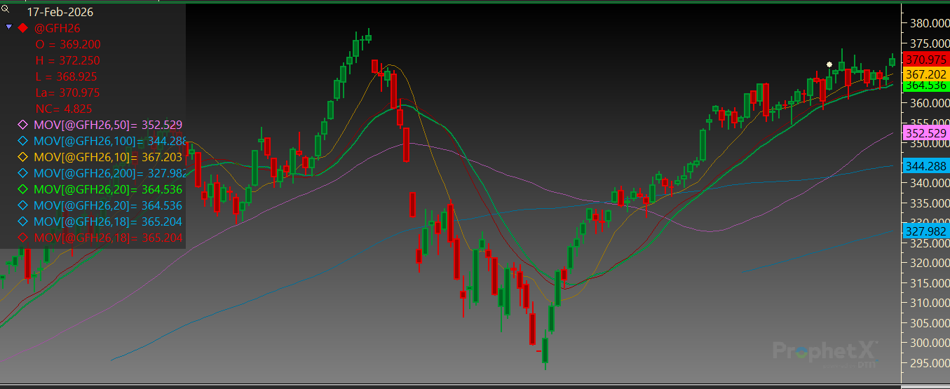 March Feeder Cattle started the week sharply higher. Resistance is at 373.600 and then 375.000. Support is at the 20-day MA of 364.525 followed 363.350.