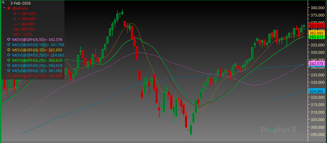 March Feeder Cattle tested yesterday’s high but could not push through that level. Resistance is at 368.400 and then 370.675. Support is at the 20-day MA of 360.625 and followed by 358.325.