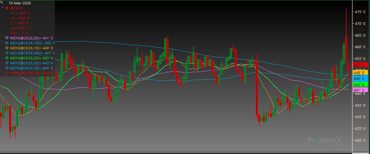 May Corn has moved back to pre-war levels. Resistance is at 464 3/4 and then 476. Support is at the 20-day MA of 443 3/4 followed by 440 1/4.