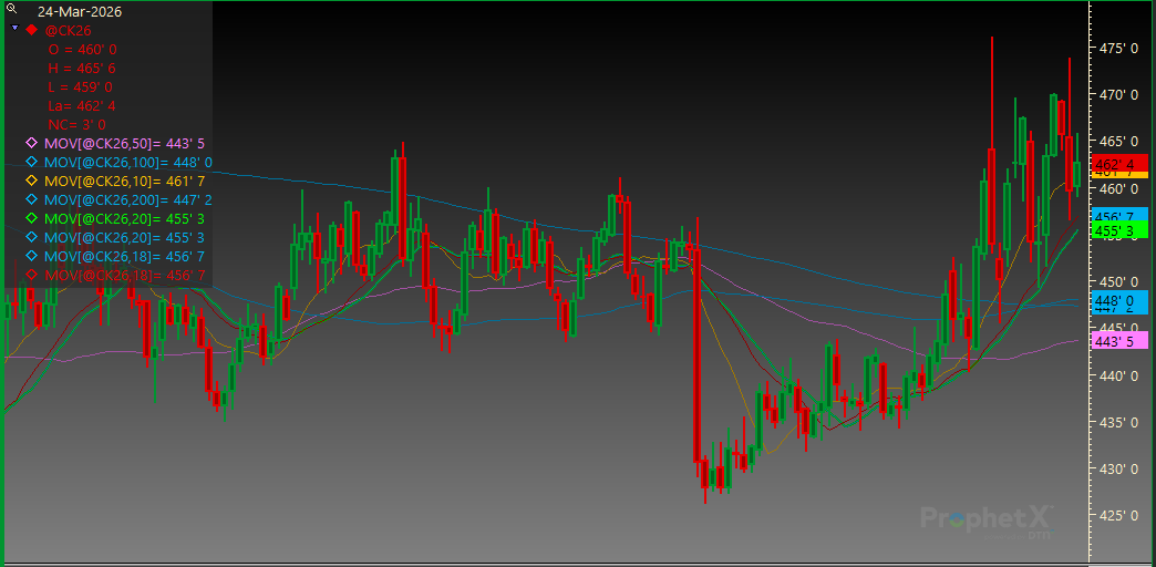 May Corn finished the day in the middle of its range. Resistance is at 473 3/4 and then 476. Support is at 456 1/2 followed by the 20-day MA of 455 1/4.