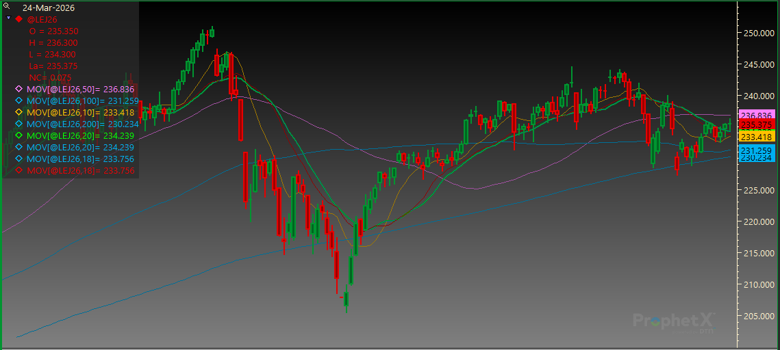 April Live Cattle have finished higher both days this week. Support is at the 20-day MA of 234.225 and then 232.500. Resistance is at 239.950 followed by 241.900.