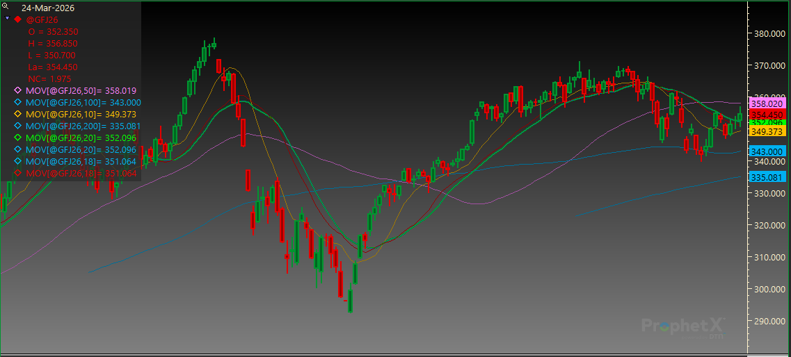 April Feeder Cattle finished above the 20-day MA today. Support is at the 20-day MA of 352.100 and then 347.025. Resistance is at the 50-day MA of 358.025 followed by 361.600.