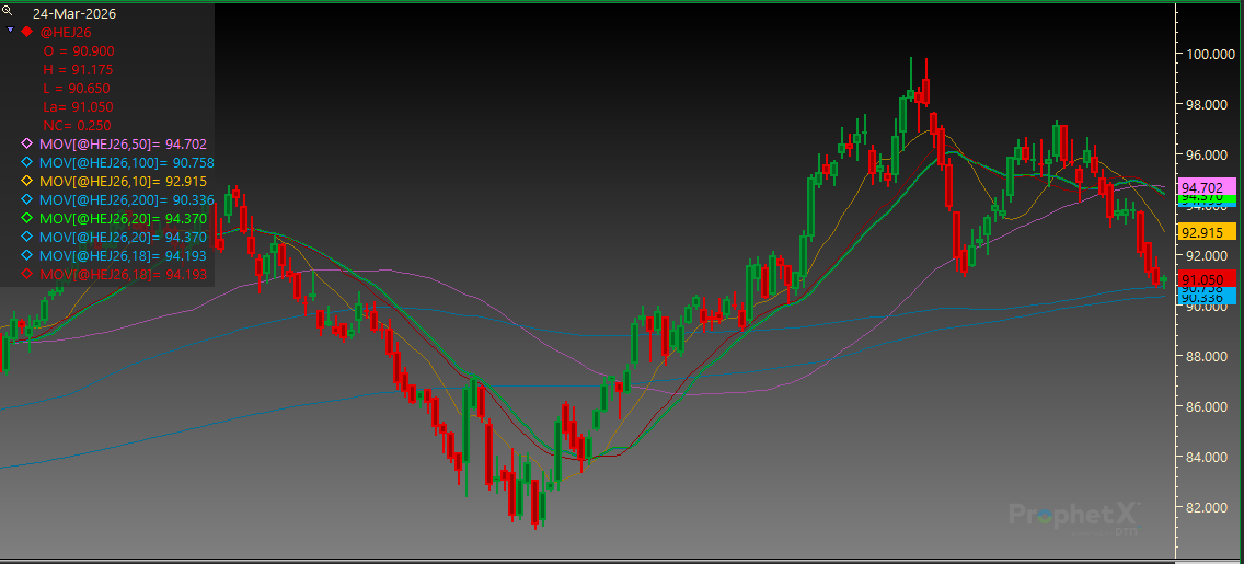 April Lean Hogs continue to trade near long term support. Support is at the 100-day MA of 90.750 and then 90.025. Resistance is at 94.075 followed by the 20-day MA of 94.375.
