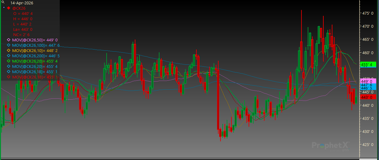 May Corn finished higher on the day but failed at overhead resistance. Resistance is at 446 1/4 followed by the 200-day MA of 446 1/2. Support is at 440 1/4 and then 438.