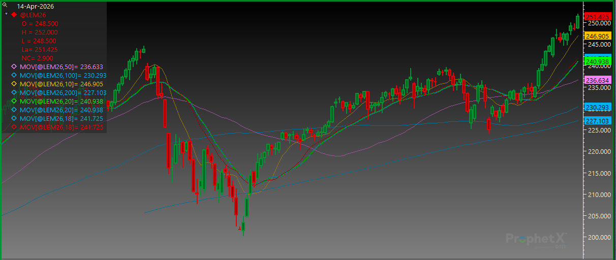 June Live Cattle broke through 250.000 today. Resistance is at 252.000 and then 253.600. Support is at 244.750 followed by 241.950.