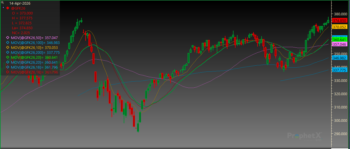 May Feeder Cattle posted a new contract high today. Resistance is at that high of 377.575 followed by 378.500. Support is at 365.525 and then the 20-day MA of 360.650.