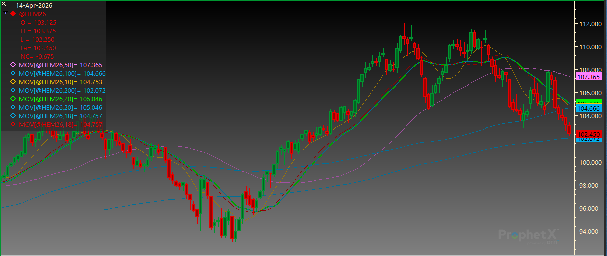 June Lean Hogs finished lower for the sixth day in a row. Support is at 102.250 followed by the 200-day MA of 102.075. Resistance is at 104.075 and then the 20-day MA of 105.050.