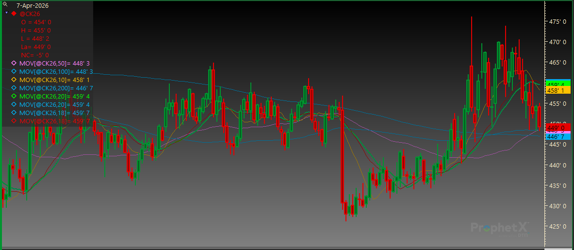 May Corn found support at the 100-day MA again today. Support is a the 100-day MA of 448 1/4 followed by 445 1/2. Resistance is at 455 and then the 20-day MA of 459 1/2.