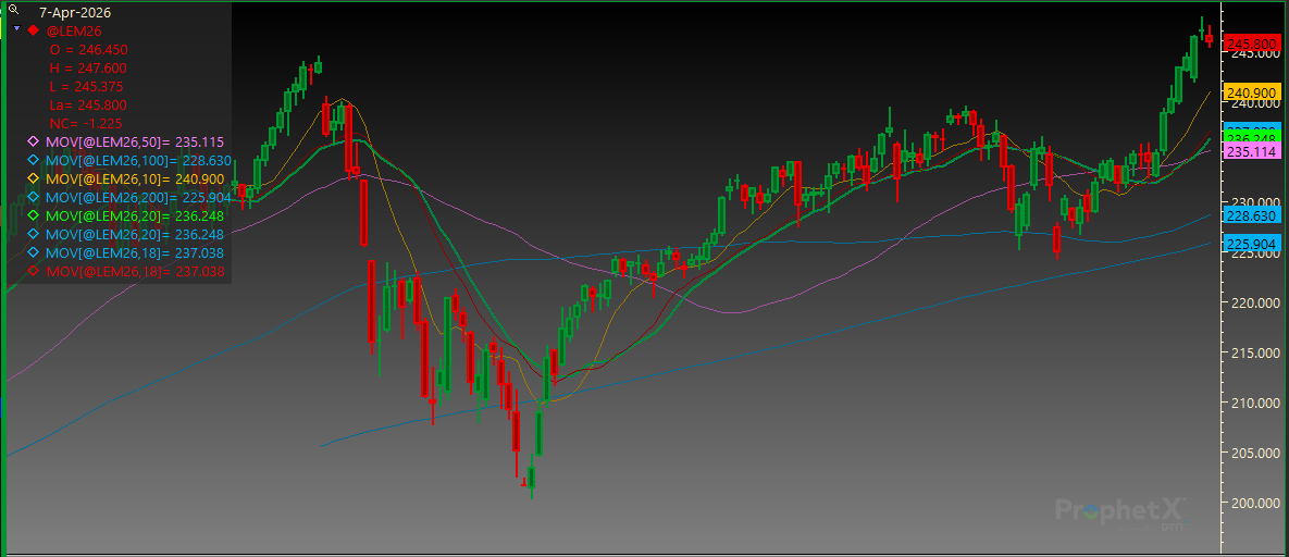 June Live Cattle finished lower for the first time in eight days. Support is at 241.950 followed by the 20-day MA of 236.250. Resistance is at 248.450 and then 250.925.