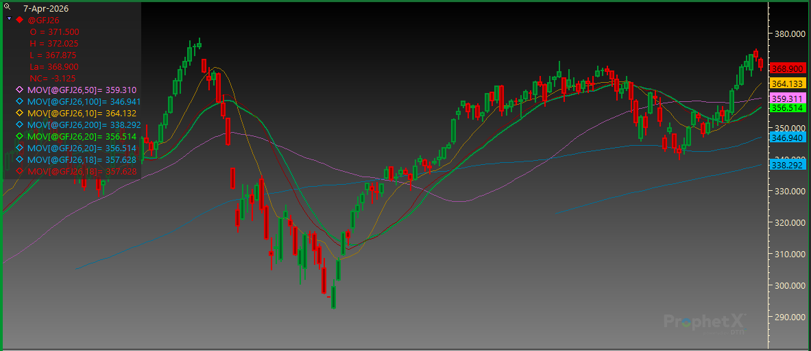 April Feeder Cattle have finished lower both days this week. Support is at 366.175 and then the 20-day MA of 356.500. Resistance is at 374.975 followed by 378.450.