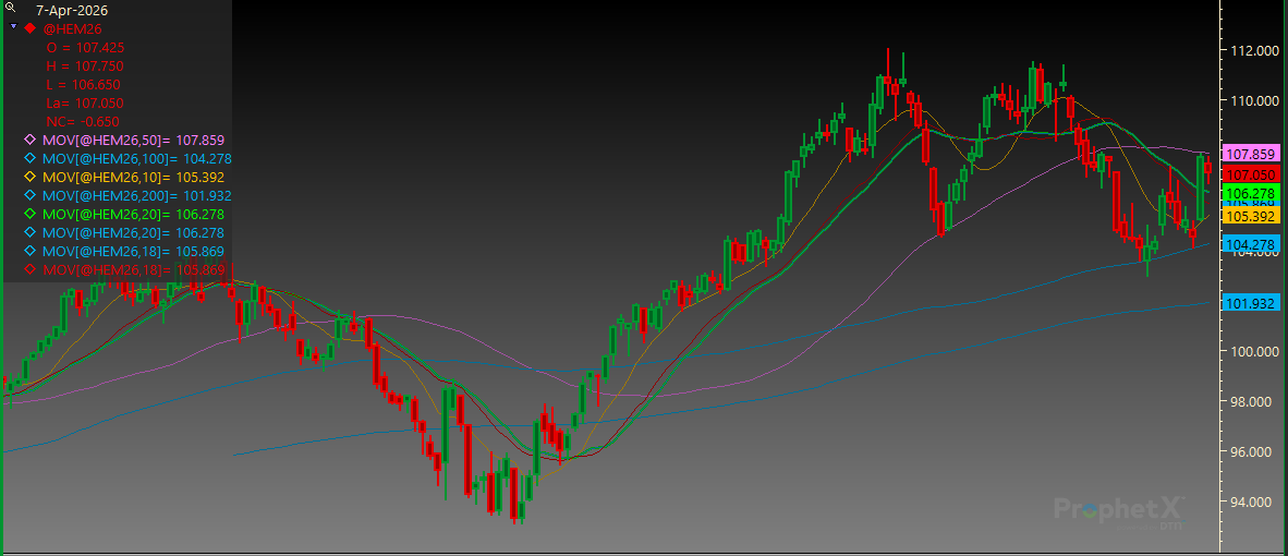 June Lean Hogs have traded back above the 20-day MA. Resistance is at 107.850 and then 109.250. Support is at the 20-day MA of 106.275 followed by 104.475.