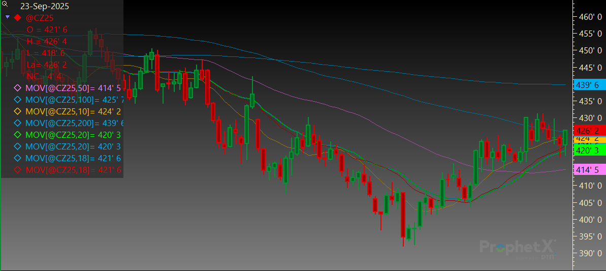 December Corn finished back above the 20-day MA again today. Resistance is at 431 1/4. Support is at the 20-day MA of 420 1/4 followed by 418 1/4.