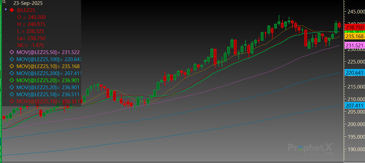 December Live Cattle could not hold all of Monday’s gains. Resistance is at 241.350 followed by the contract high of 243.575. Support is at the 20-day MA of 236.900 followed by 235.725.