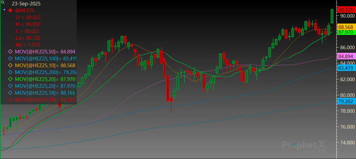 December Lean Hogs posted a new contract high. Resistance is at that high of 90.850. Support is at 88.750 and then the 20-day MA of 87.975.